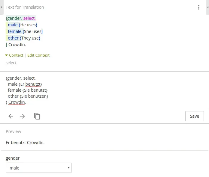 Crowdin recognizes ICU formats and with a help of really handy Pre-view option makes it possible to observe different variations. Syntax is also highlighted so it is very convenient to keep required areas within the sight and manage translations swiftly!